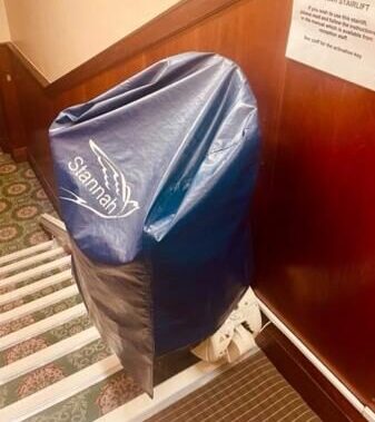 On the right-hand side of the main hall, a set of steps leads to the rear of the building, where a chair lift has been installed for accessing this level. Our staff will gladly assist you with using the chair lift if needed.